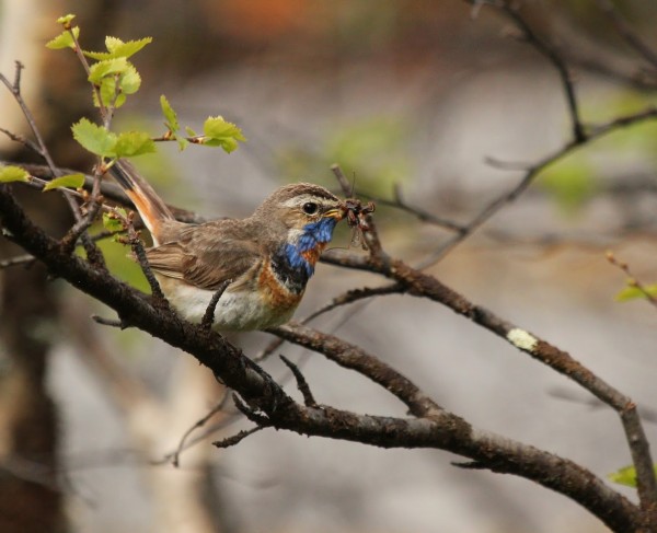 Je nás jen hrstka, zbytek skupiny se vydal k lanovce na horu Njulla. Je tu krásně, najednou zaslechnu povědomé kontaktní hlasy a teď ho i zahlédnu, slavík modráček tundrový. Krasavec s modrou náprsenkou s cihlově červeným flíčkem pod krkem. Nejprve vidím samičku, která není tak pestře zbarvená. Má plný zobáček naloveného drobného hmyzu, pravděpodobně krmí mláďata. Fotím ji a pokračuji dál.