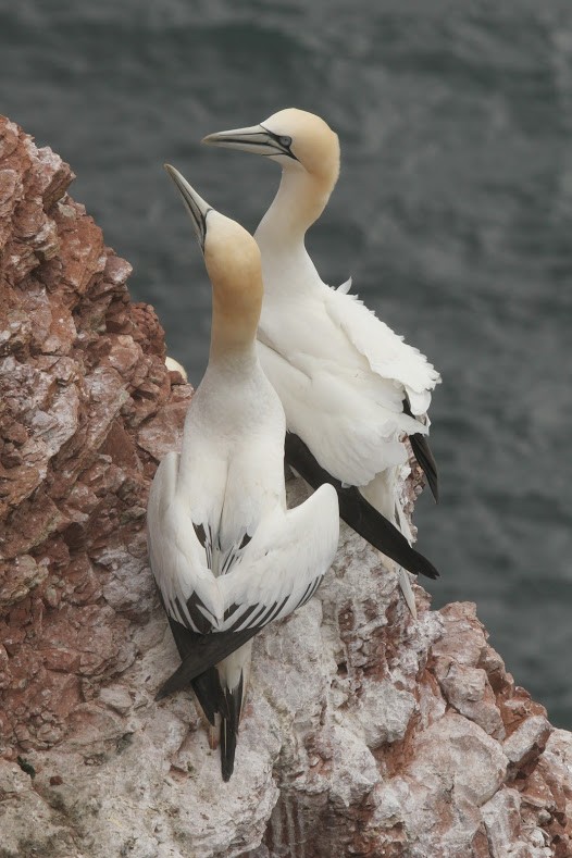 Už jsem se nemohla dočkat až poprvé v životě spatřím elegantní tereje bílé. Jelikož jsme ale během našeho pobytu s Fototripem bydleli na vedlejším ostrově Düne a na první den bylo naplánováno focení tuleňů, musela jsem si ještě chvíli počkat na úžasné ptačí útesy ostrova Helgoland. Čekání ale stálo za to, opravdu mě překvapilo, jak jsou terejové lidem blízko, byli zde chatrné zábrany, aby někdo nechodil příliš blízko ptákům či spíše okrajům útesů, ty jsme samozřejmě respektovali, vždyť i tak se člověk mohl hodně zblízka stát na chvíli "členem" kolonie terejů, alkounů a racků. U terejů jsem na Helgolandu strávila poměrně dost času, navštívili jsme je celkem po dva dni. Zažila jsem zda snad každé počasí, které zde na jaře může být a tím pádem jsem si vyzkoušela focení v různých světelných podmínkách. Prakticky po celou dobu (a to i když svítilo sluníčko) zde foukal urputný vítr, který s námi chvílemi lomcoval jak o závod, že jsem skoro ani neudržela fotoaparát ve vodorovné poloze. Několikrát se i pěkně rozpršelo, ale já jsem vytrvala....Ještě, že jsem měla s sebou rukavice, jinak by mi tu ruce snad upadly. Po čase jsme si všimli na naše outdoorovém oblečení drobných bílých kapiček, které ovšem nebyly od deště, pokud nebudete za déšť pokládat spršku ptačích výkalů, kterou krásně rozptylovat vanoucí vítr po všech na útesech. Moc se mi líbilo, jak terejové plachtili na místě, to jsem si opravdu užívala, dali se tak mimojiné i výborně vyfotit, když vlastně stáli ve větru.